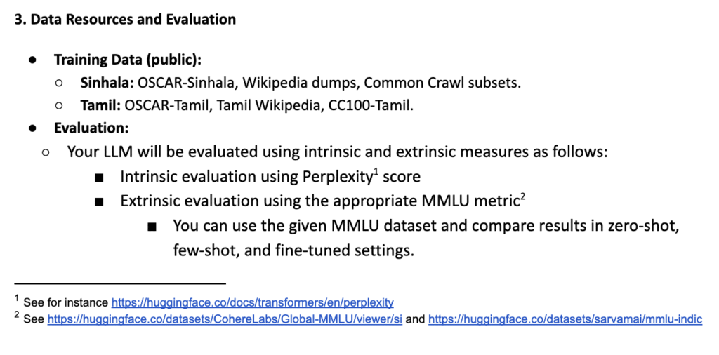 - Goal: Foster development of compact, high-quality LLMs for Sinhala and Tamil by continual pre-training or fine-tuning open-source models with ≤ 8 billion parameters.
